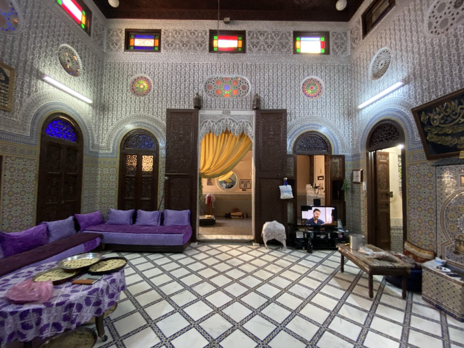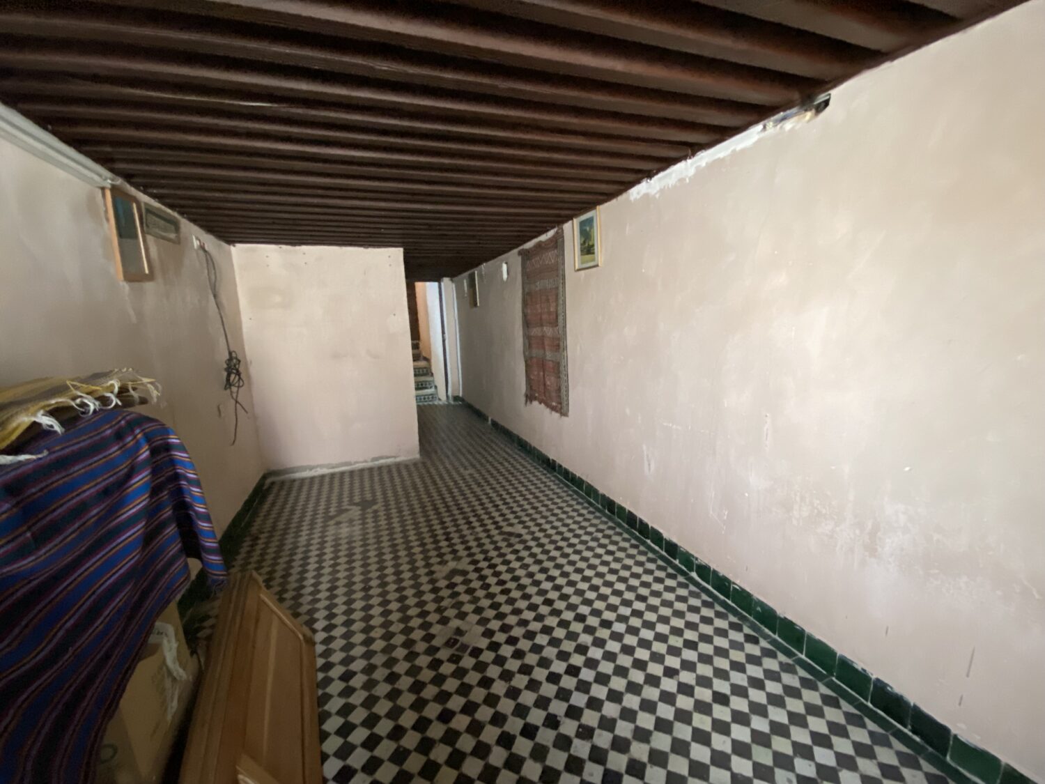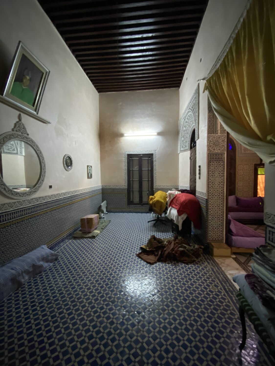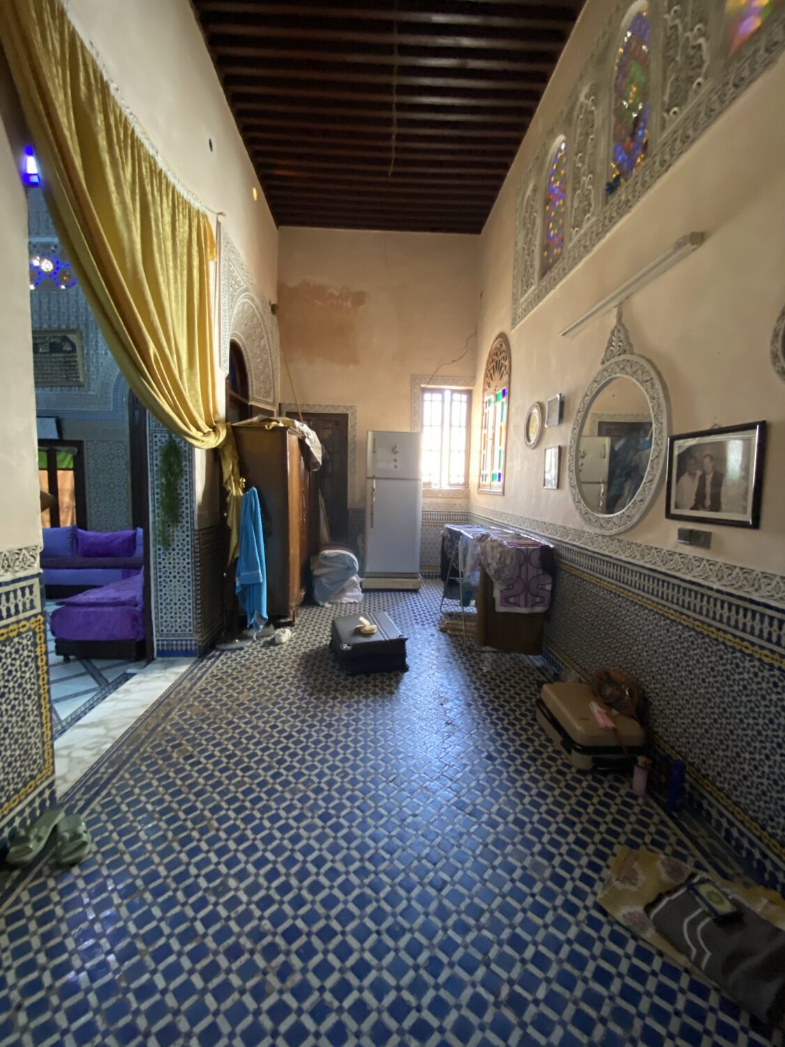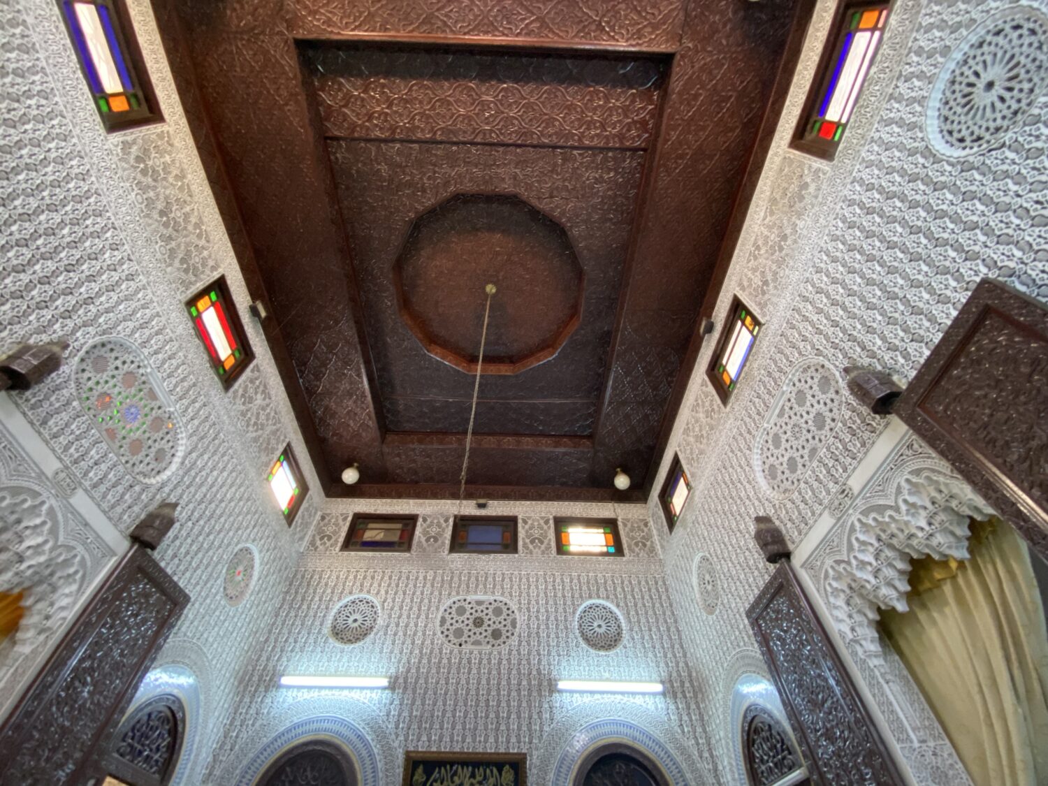 The patio is spacious and decorated with a wealth of plasterwork, glass, zellige, and wood carvings. The floor is still the original marble.