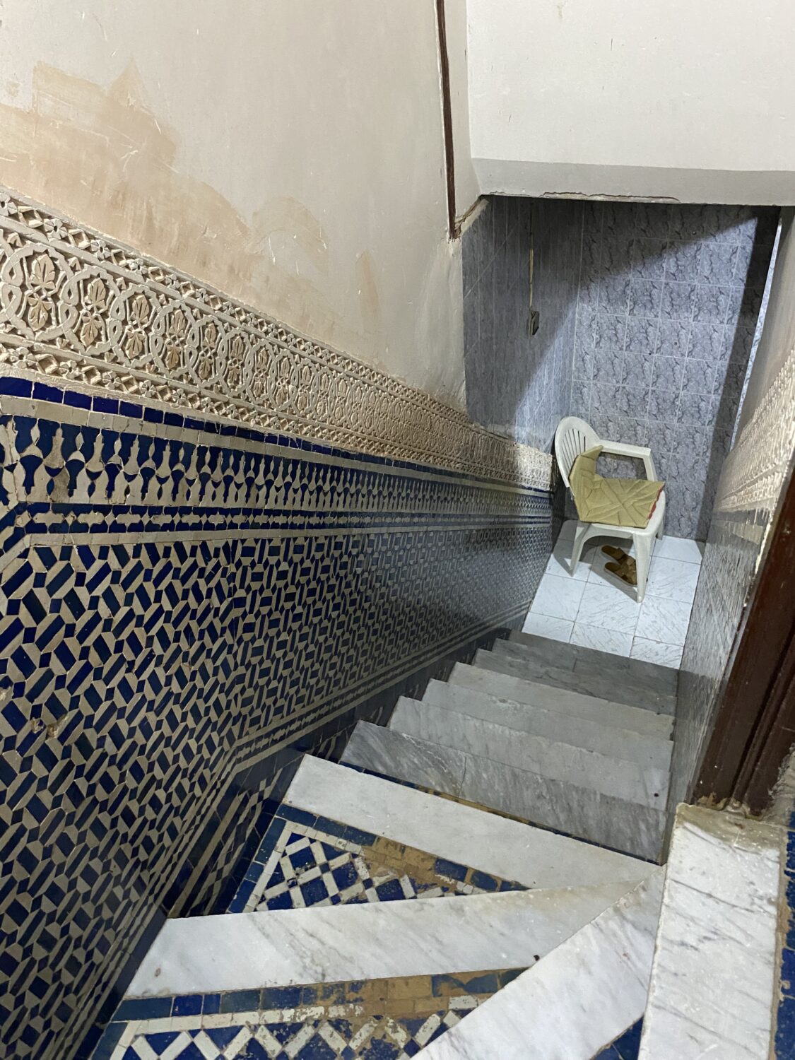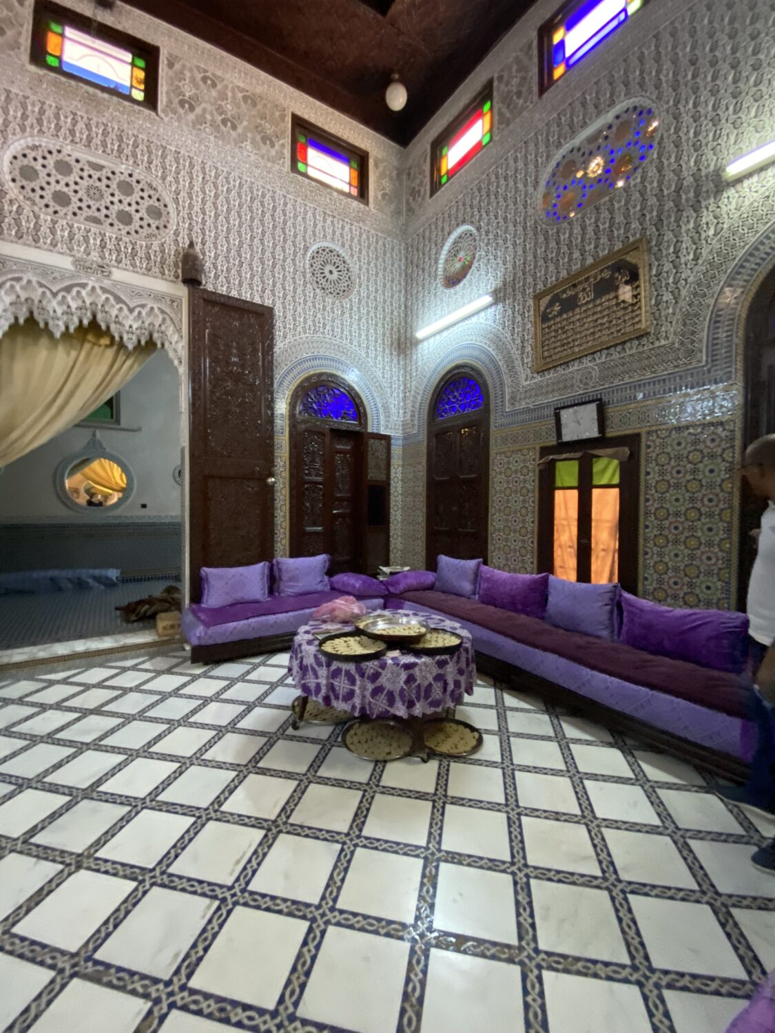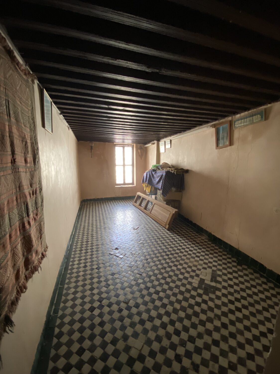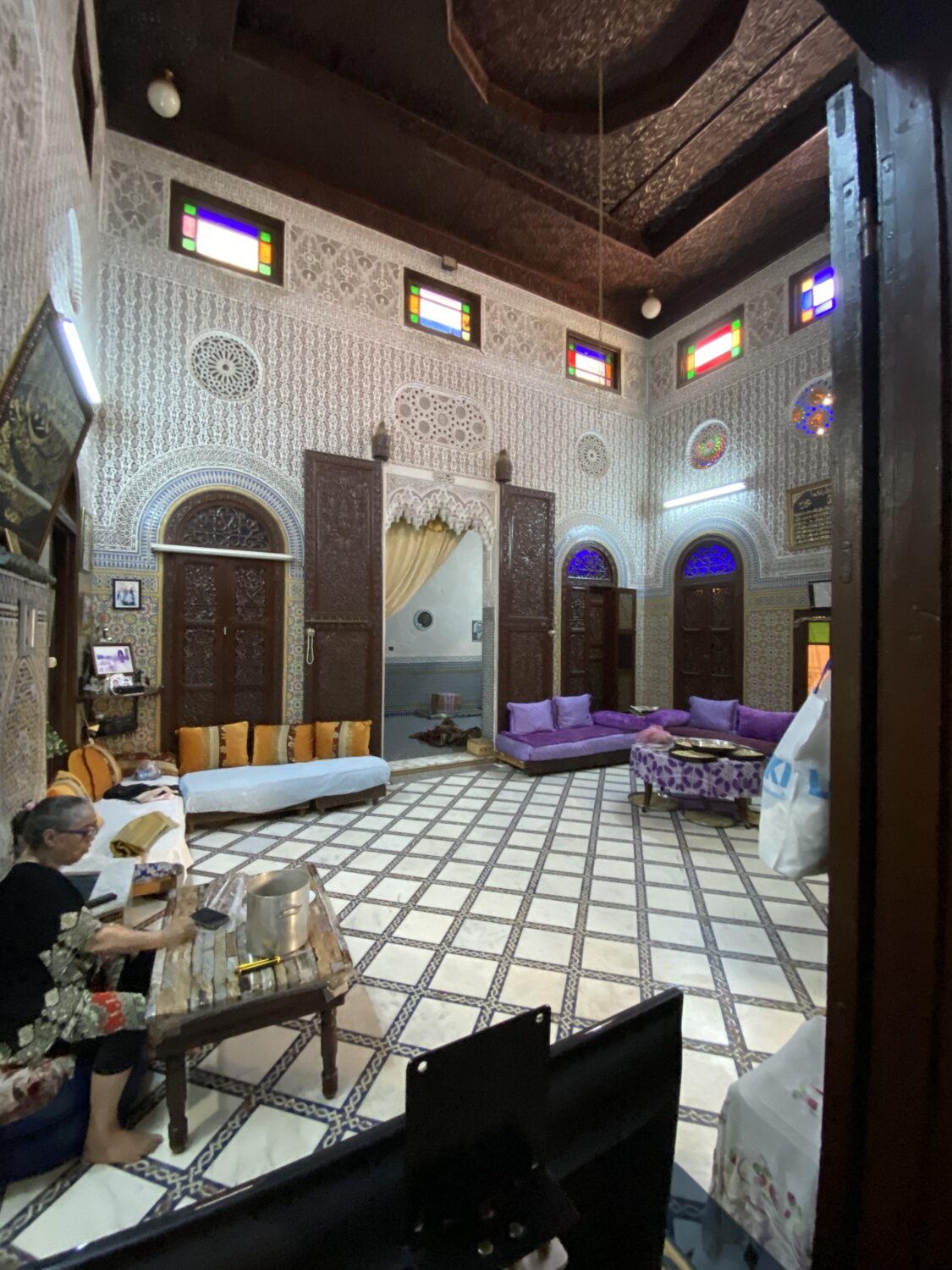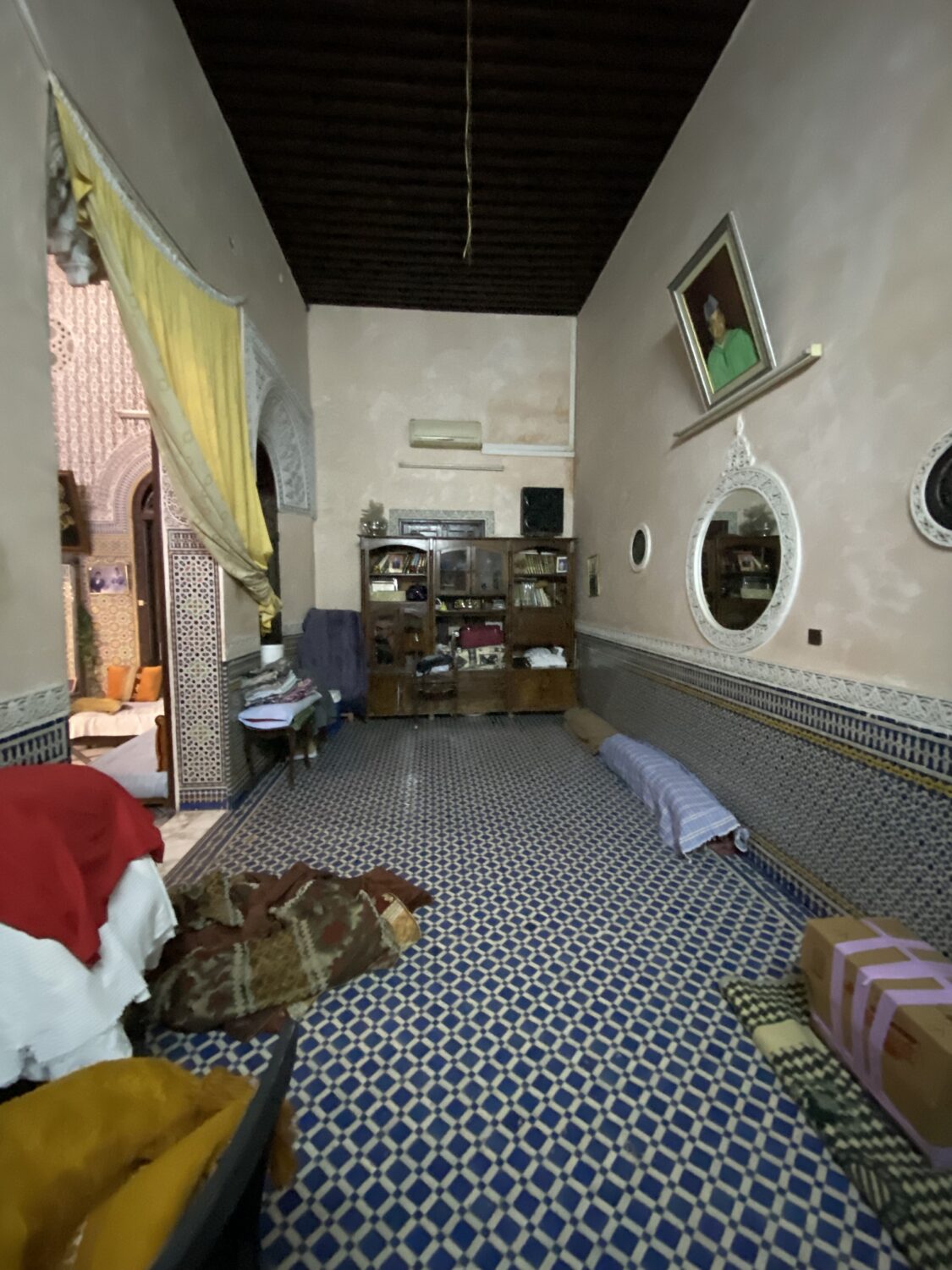 The patio is spacious and decorated with a wealth of plasterwork, glass, zellige, and wood carvings. The floor is still the original marble.