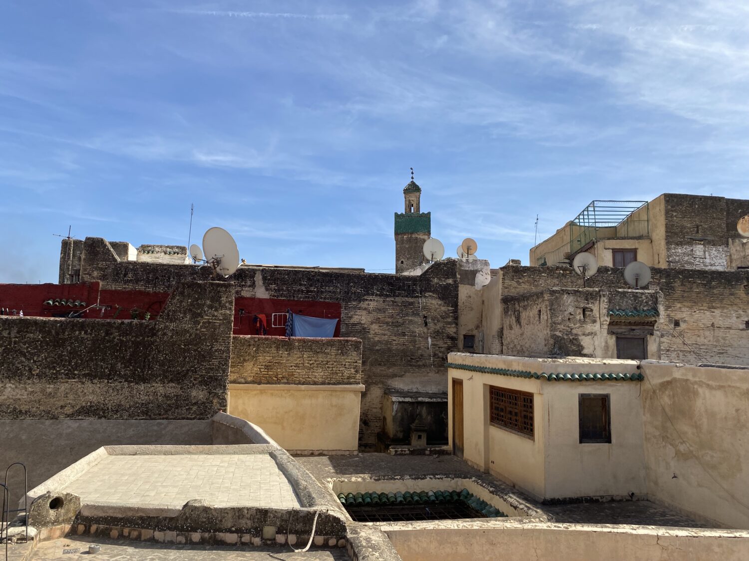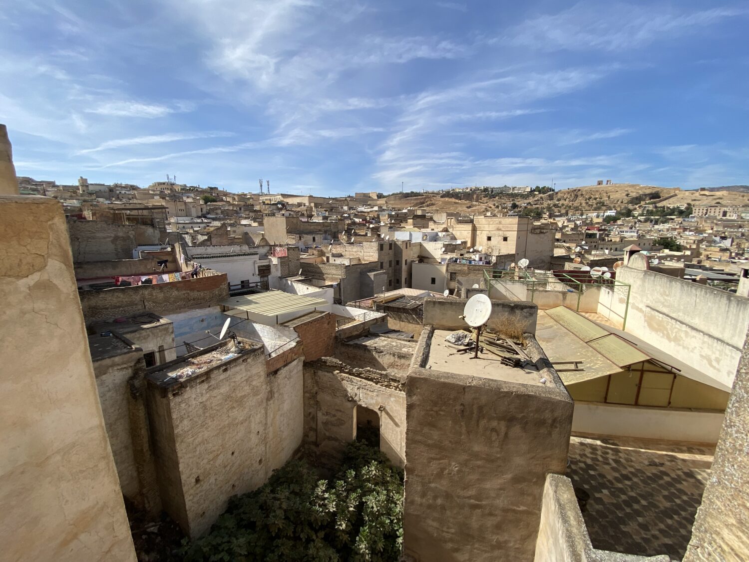 Het uitzicht vanaf het bovenste terras strekt zich uit over de medina tot aan het Palais Jamaï en de berg Zalagh.